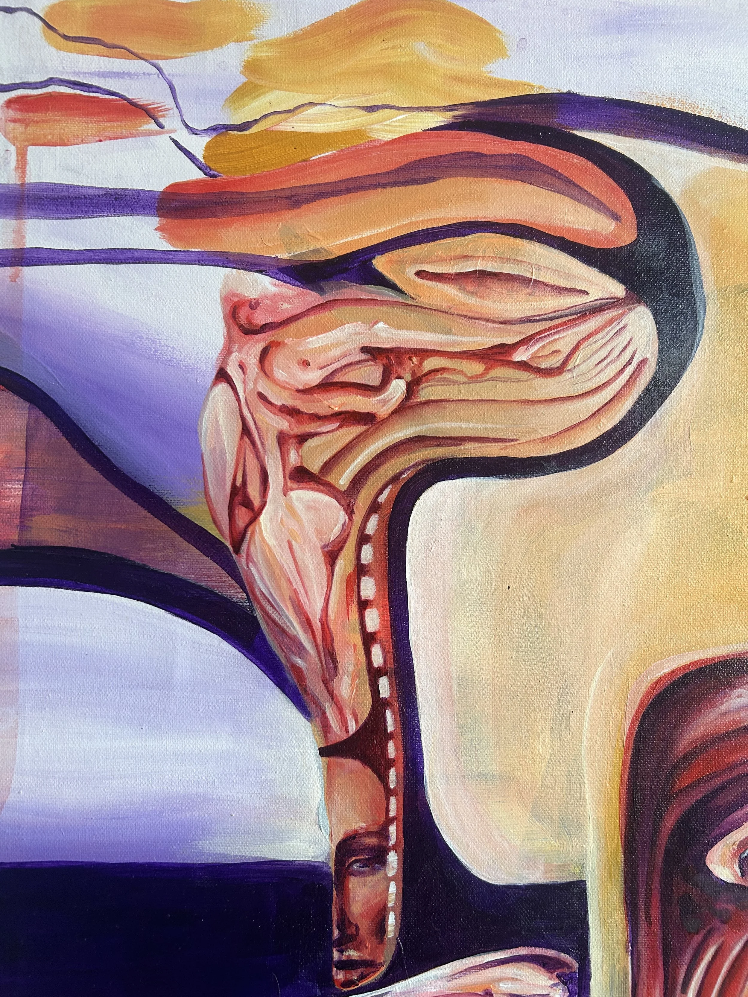 “Hide and Seek” was built slowly and in motion, carried from city to city across Spain. I worked on it between train rides, beside beaches, and after riding horses through the wild landscapes of Jerez. The palette reflects the vibrancy of Spain itself — sun-washed colors, warm earth, deep shadows, and the energy of riding freely across cliffs and olive fields. It’s a painting about discovery, movement, and the way travel opens you up to parts of yourself you didn’t know were waiting.